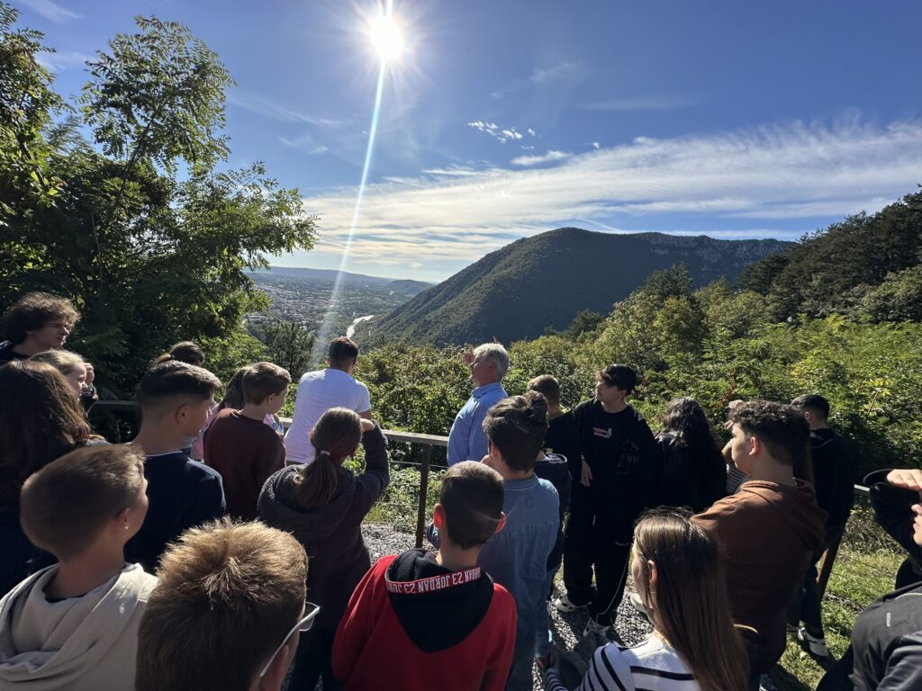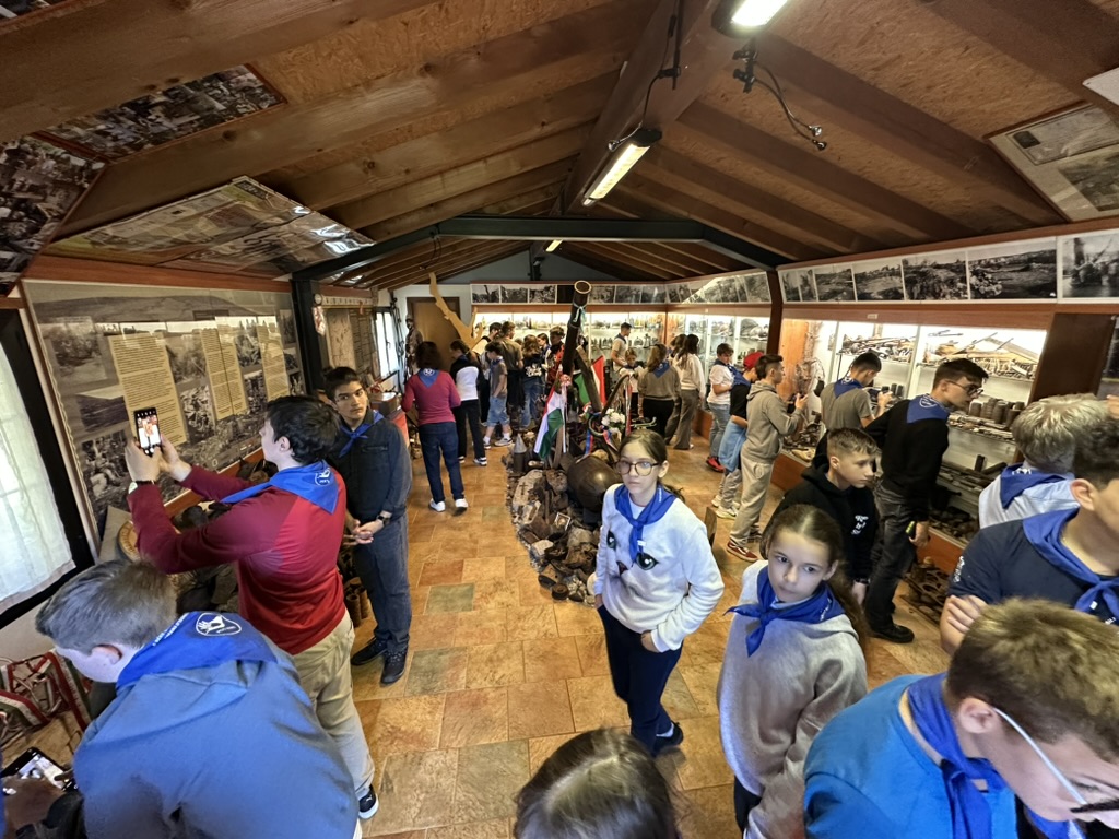 A tanulmányút harmadik napja az emlékezés és a nemzetközi együttműködés jegyében telt. Délelőtt az olaszországi Sacrario di Redipuglia monumentális háborús emlékhelyén találkoztunk az olasz Istituto Comprensivo Celso Macor (Romans d’Isonzo) és a szlovén Osnovna Šola Ivana Roba diákjaival. A három nemzet fiataljai közös koszorúzással és főhajtással rótták le tiszteletüket a Nagy Háború hősei előtt. A megemlékezésen a települések és iskolák vezetői is jelen voltak, kifejezve elismerésüket a közös emlékezés és az ifjúság hadtörténelmi alapú hazaifas nevelése iránt. Ezt követően a Foglianóban található Osztrák–Magyar Katonai Temetőben is elhelyeztük az emlékezés koszorúit, majd gyalogmenetben indultunk tovább a Monte San Michele csúcsán álló emlékhelyre. A rövid pihenőt és közös ebédet követően Gianfranco Simonit úr tartott történelmi ismertetőt a helyszínről és az itt harcoló alakulatokról. A program San Martino del Carso településén folytatódott, ahol a Nagy Háború Múzeumát látogattuk meg, majd Marino Visintin úr vezetésével felkerestük a híres Heim-tölcsér hadihelyszínt is. A nap zárásaként a Nagyváradi 4. Honvéd Gyalogezred Emlékgúlájánál és a Magyar Kápolnánál hajtottunk fejet, ezzel méltó módon zárva a napot.
